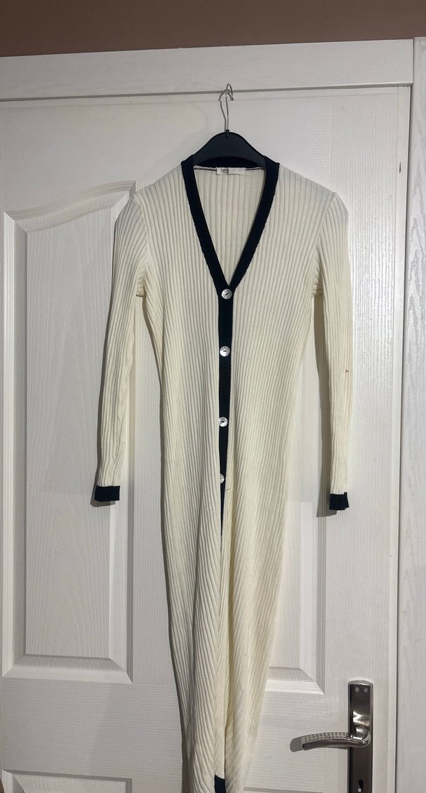 Düğmeli, uzun kollu, v yakalı ve ince kesimli beyaz elbise. Siyah detaylar ve sentetik kumaşıyla gündelik kullanıma uygun, sade ve şık bir parça.