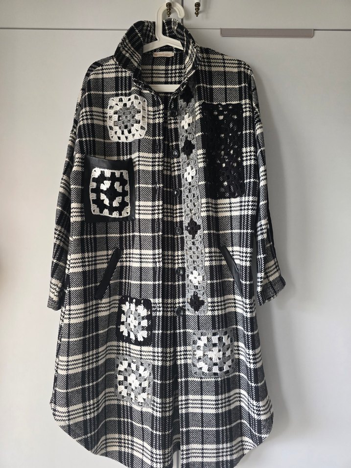 Düğmeli, uzun, bol kesim gri desenli mont. Notlu yaka ve uzun kolludur. Bohem tarzıyla rahat ve günlük kullanıma uygundur.