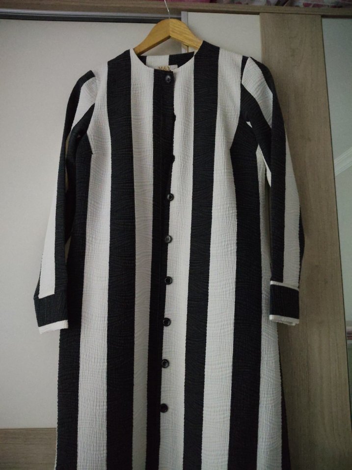 Düğmeli ön kısmı ve kesik yaka detayı olan uzun kadın kaban. Sentetik kumaştan, regular fit ve siyah-beyaz geniş çizgili, günlük kullanım için uygun bir sokak stili parçası. kol boyu:58.5 kol eni 17 .kapın boyu 1m 8.5 cm.iki koltuk altı arsı uzunluk 48 iki omuz arası uzunluk 37