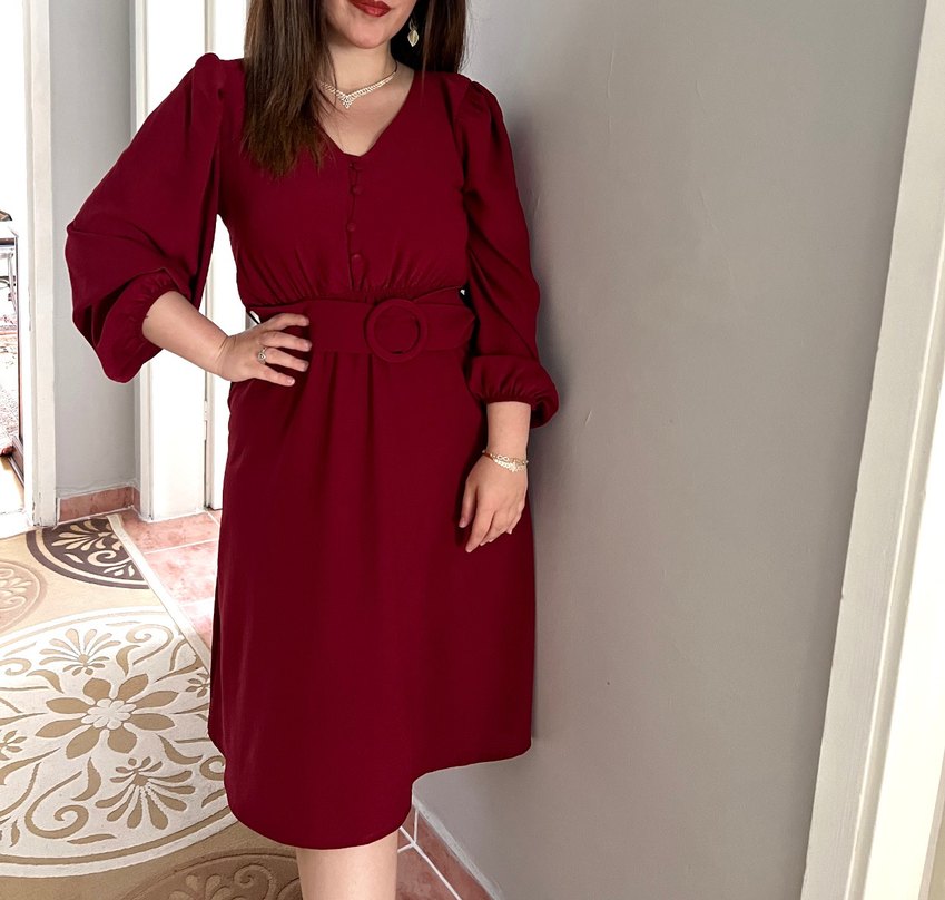 Bordo renkli, uzun kollu, düğmeli ve V yaka tasarımlı uzun elbise. Rahat kesimi ve ipeksi kumaşıyla modern klasik stil sunar, ofis ve şık günler için uygundur. İki koltuk arası 48cm , bel lastik açılınca 35-40cm, boy uzunluğu 110cm’dir. iç göstermez. Kemer yanlardan sabit. Kolları pileli uzundur. Trendyol ürünüdür bir sorunu yoktur. 40 beden uyumlu.
