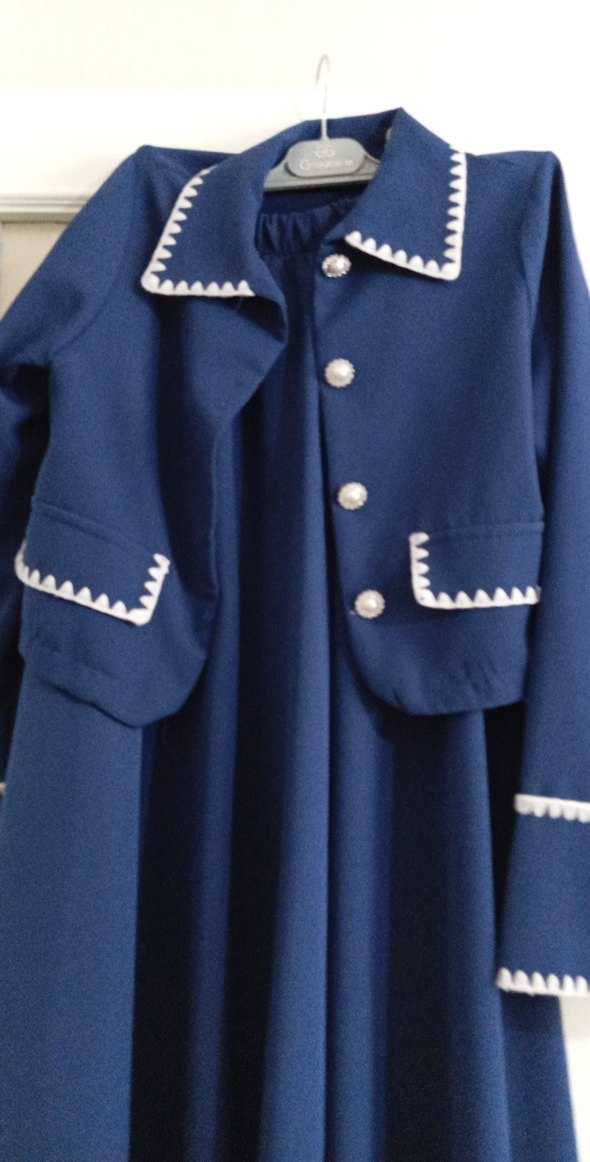 Düğmeli kapamalı, işlemeli detaylı uzun mavi etekli takım Çentikli yaka ve uzun kollu, klasik Paris tarzında, ofis kullanımı için uygun. ✨
