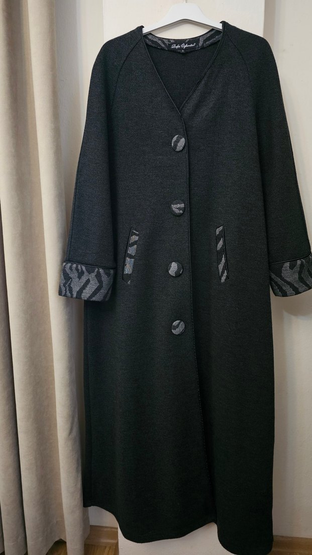 Düğmeli, kruvaze yakalı uzun gri kaban, zebra desenli manşet ve ceplerle. Rahat kalıp ve uzun kollu, yumuşak ve sıcak kumaştan üretilmiştir. kol altı 57 cm. boyu 1.37 cm'dir. Çelik örmedir.