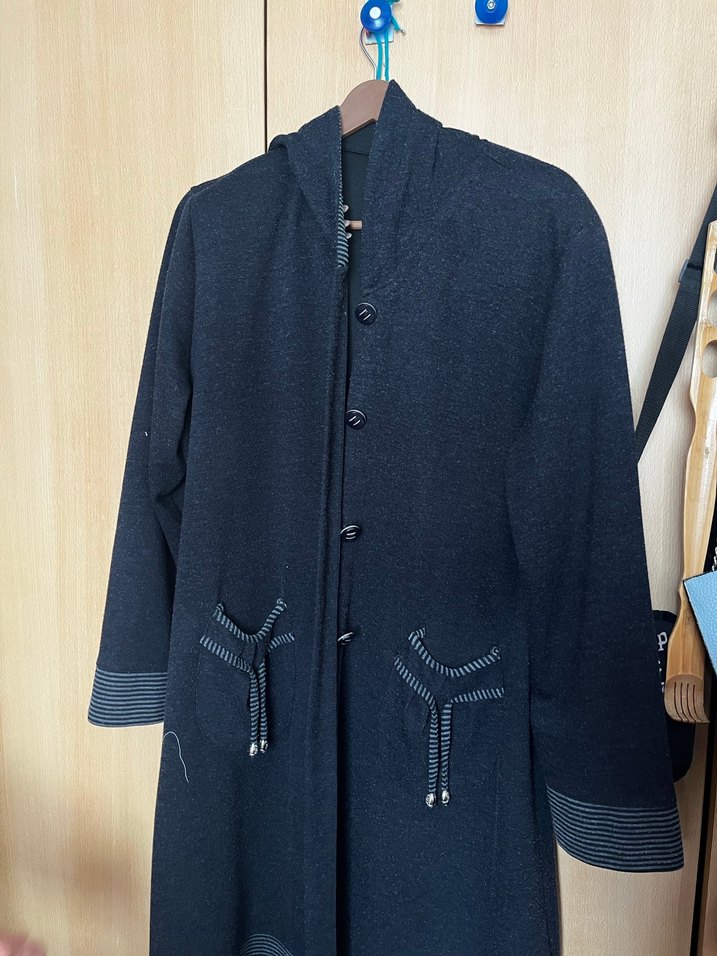 Düğmeli, uzun gri kadın kaban, yumuşak ve sıcak kumaştan, nakış detaylı, rahat kesim ve uzun kollu, günlük kullanım için uygundur.