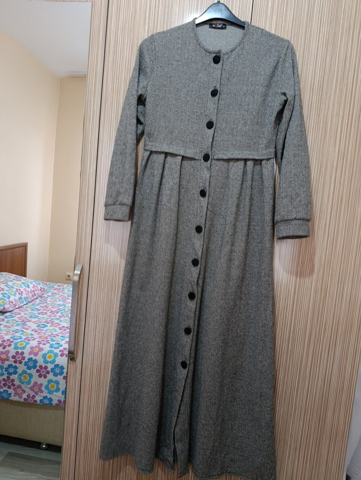 Düğmeli Uzun Gri Keten Elbise