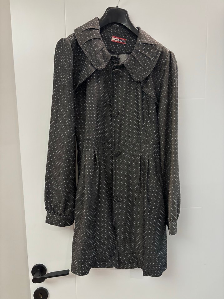 Düğmeli, uzun kesim, gri renkte, puantiyeli kadın kaban. Sentetik kumaştan, geniş kesim ve ofis için uygun.