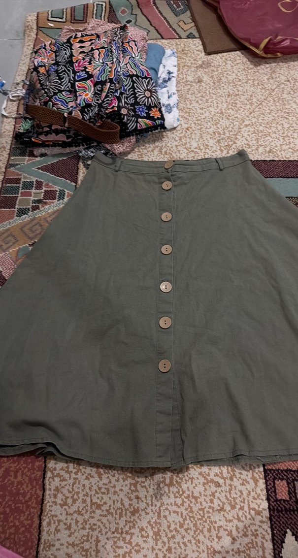 Düğmeli, bol kesim uzun haki etek, yumuşak sentetik kumaştan. Günlük bohem ve rahat tarzlar için uygundur.