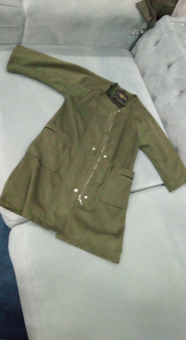 Düğmeli ön kısmı ve kesik yaka detayı olan uzun haki hamile kabanı. Bol kesim, uzun kollu ve büyük ceplidir. Yumuşak ve sıcak dokulu kumaştan üretilmiştir.