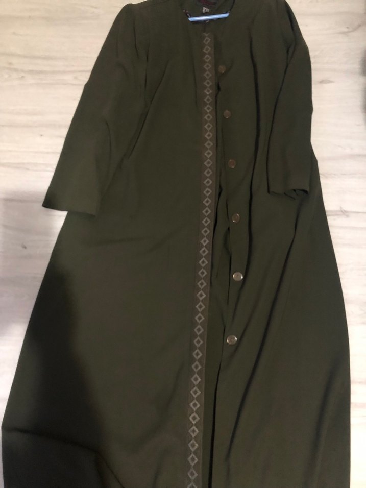 Düğmeli önü ve kesik yaka yakası olan uzun haki kadın kabanı. Uzun kollu, sentetik kumaştan, günlük kullanım için uygundur.