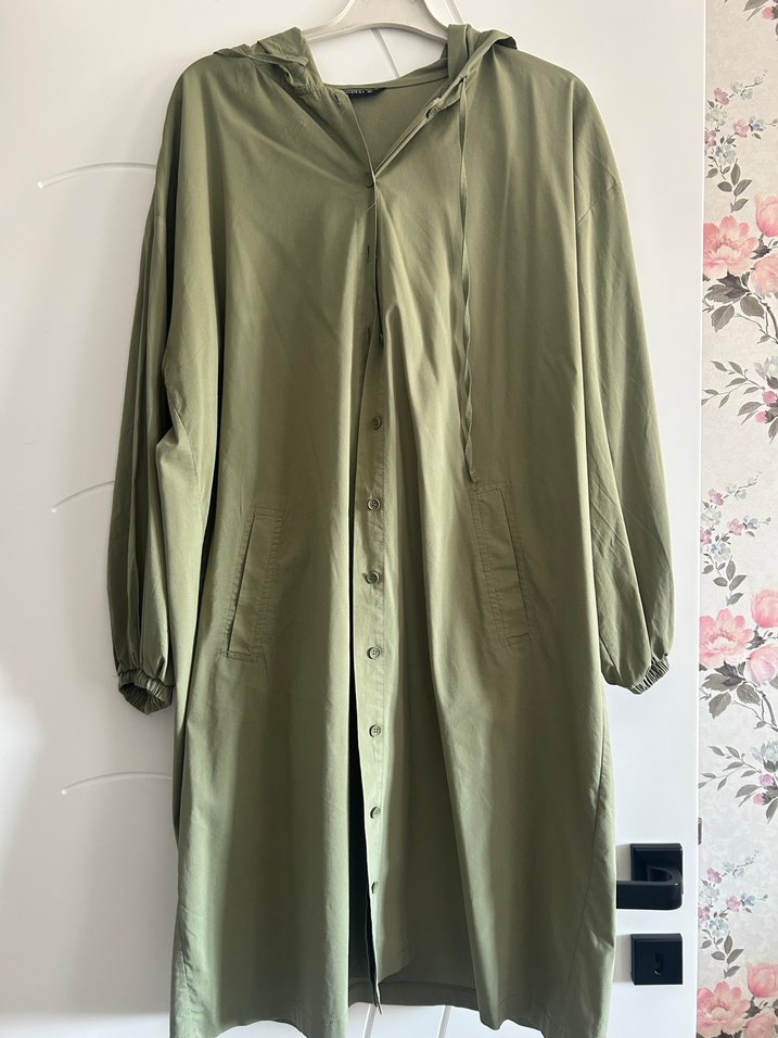 Düğmeli, uzun, haki renkli, bol kesim kadın kaban. Uzun kollu, kırlangıç yaka ve ceplidir. Yumuşak sentetik kumaştan yapılmıştır.