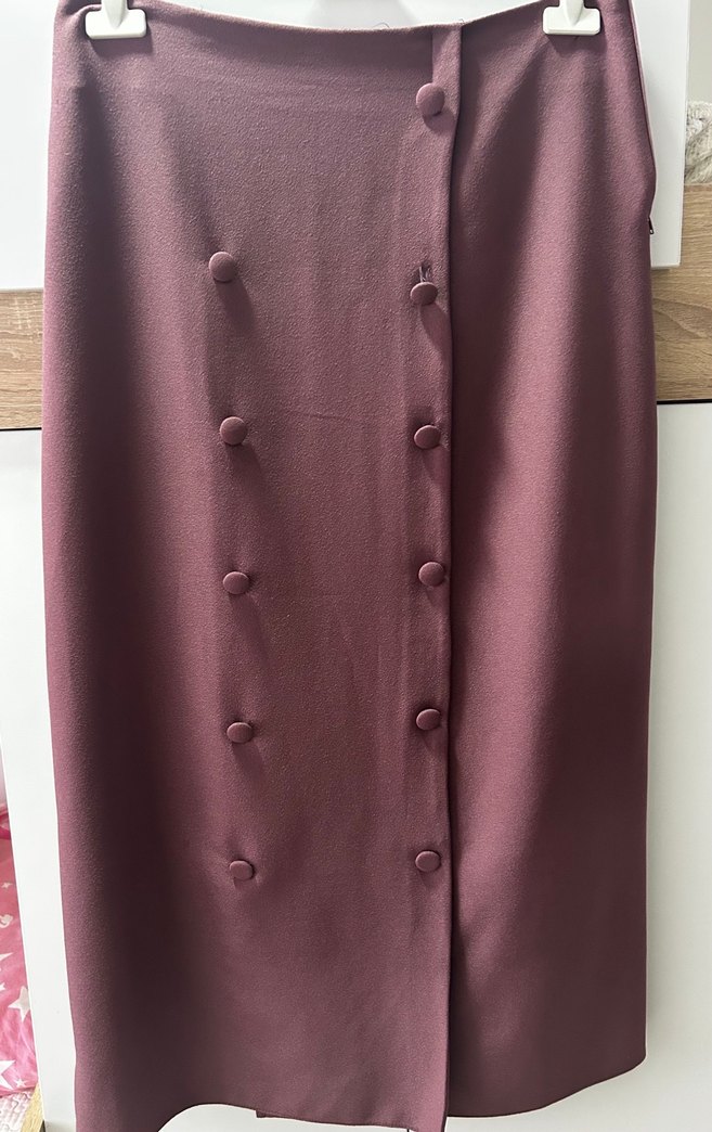 lila renkli, parlak sentetik kumaştan yapılmış, düğmeli uzun kadın etek takımdır