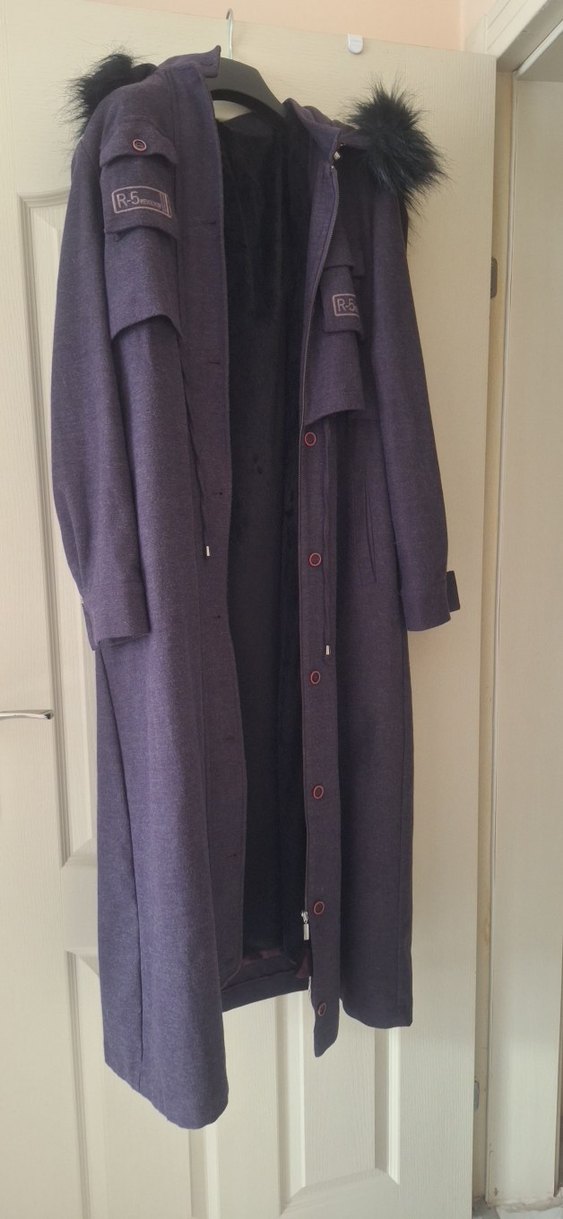 Kadınlar için düğmeli, uzun kollu ve düz kesim mor kaban. Yumuşak ve sıcak kumaştan, günlük kullanım için rahat içimdeki yünlü kısım fermuarlı dilerseniz çıkarabilirsiniz aynı şekilde şapka da çıkabiliyor Tuğba marka hiç bir yerinde birşey yok boyu 125 cm