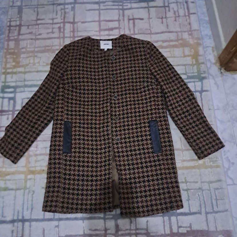 Düğmeli, uzun kahverengi kadın kabanı, notched lapel yakaya ve uzun kollara sahiptir. Sentetik kumaştan olup sokak stili ve günlük kullanım için uygundur.