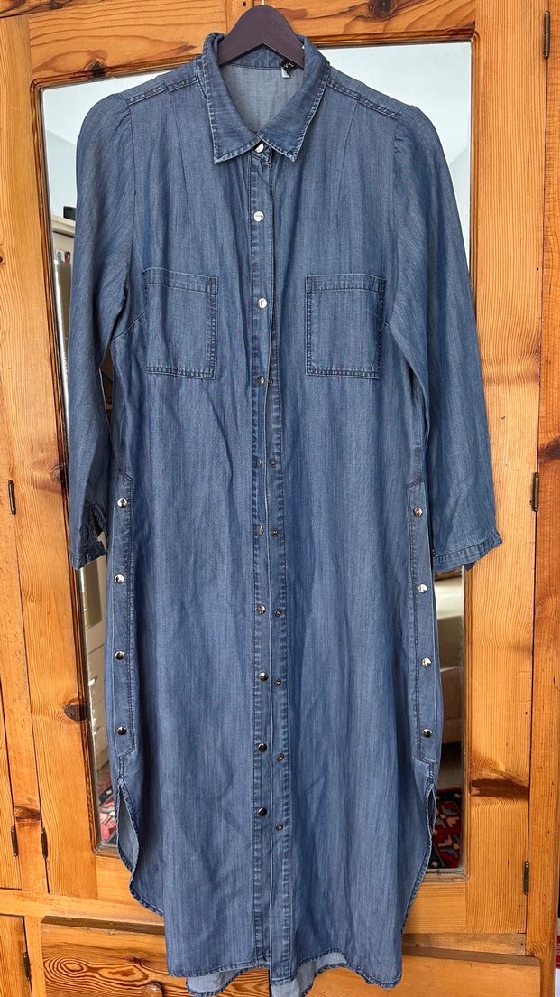 Lacivert uzun kot ceket, bol kesim ve düğmeli ön tasarıma sahiptir. Uzun kollu, kesik yaka ve yanlarda düğme detayları bulunur. Günlük bohem tarz için uygundur.