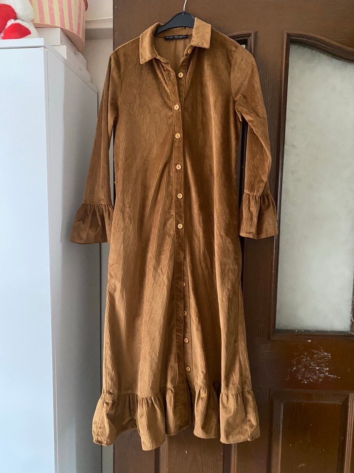 Kahverengi süet uzun elbise, düğmeli ön ve yakalıdır. Uzun kollu, volanlı manşet ve bol kesimle bohem tarzı yansıtır. Parlak dokusu ve volanlı etek ucu vardır.