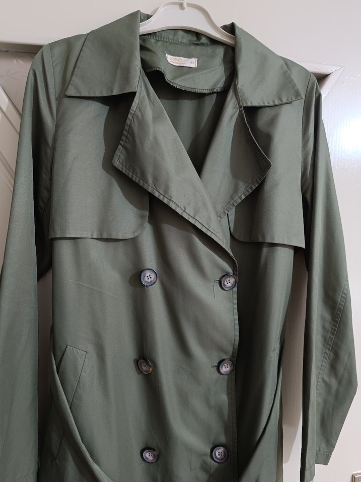 Düğmeli, yakalı, uzun kollu, düz desenli kadın trençkot. Su geçirmez bı iki defa giyindim .hiç sorun yok 42 bedene de rahat olur