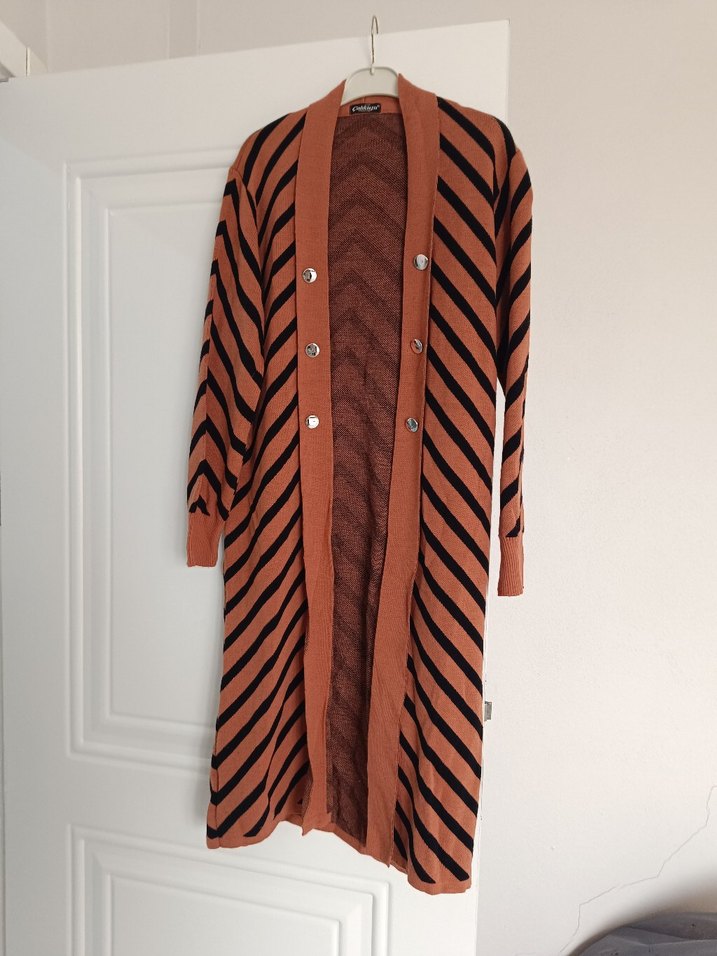Uzun, kahverengi ve siyah çapraz çizgili, düğmeli, notched lapel yakalı, bol kesim, uzun kollu örgü hırka. Bohem tarzına uygun, rahat ve sıcak.etiketi yok ama hiç giylmedi