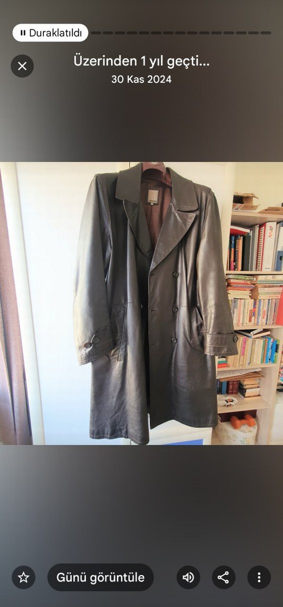 Uzun kahverengi deri erkek ceket, düğmeli ve keskin yakalıdır. Uzun kollu, regular fit ve ofis ile sokak stiline uygundur. Desensiz ve Parisli avangart tarzı yansıtır.