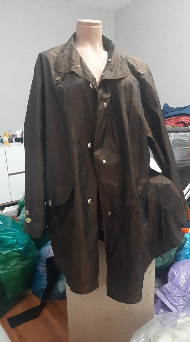 Düğmeli, uzun ve bol kesim erkek yağmurluğu, koyu kahverengi deri malzemeden yapılmıştır. Uzun kollu, yakası kesik ve günlük kullanıma uygundur. ️