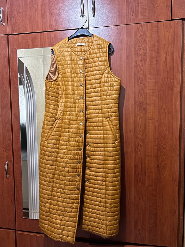 Düğmeli önü ve yakalı, parlak kahverengi deriden uzun, kolsuz yelek. Günlük sokak modasına uygun, rahat kesim ve konforlu bir tasarım sunar.