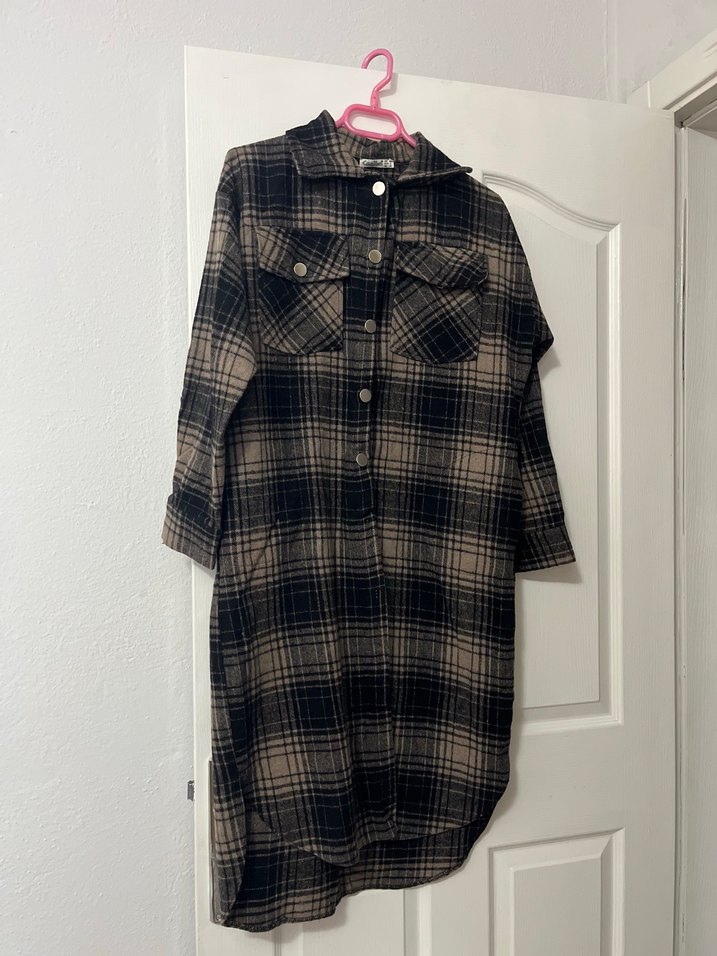 Düğmeli Uzun Kahverengi Ekose Kadın Gömlek