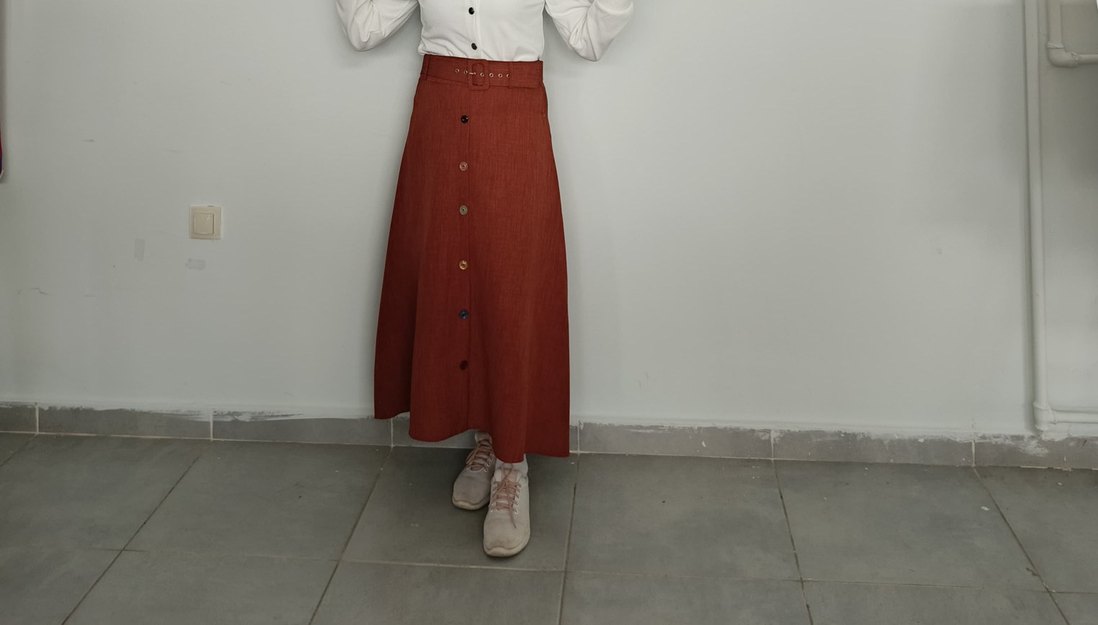 Düğmeli ön kısmı ve bol kesimiyle parlak sentetik kumaştan uzun kahverengi etek, günlük sokak tarzına uygun.birkax kez kullanılmıştır .