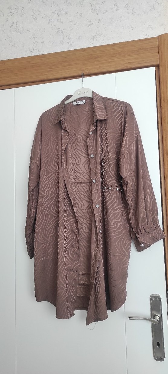 Uzun kollu, bol kesim kadın gömleği. Parlak kahverengi saten kumaş, işlemeli detaylar ve düğmeli tasarım bohem tarzı tesettür gömlek tuniktir.