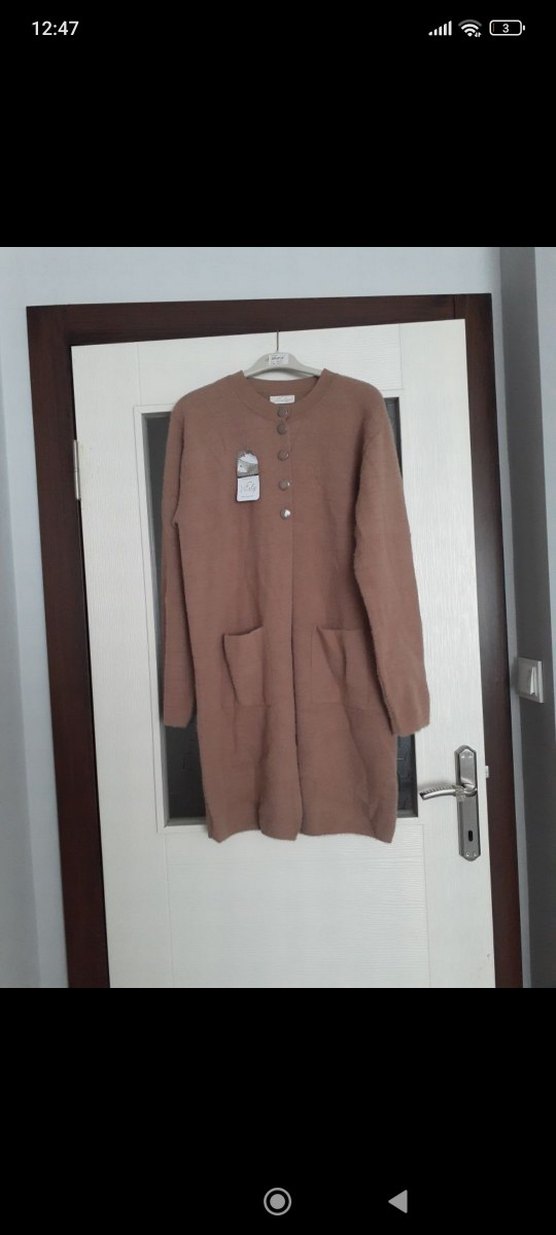 Düğmeli uzun kahverengi kadın hırka, yumuşak yünden üretilmiş, bol kesim ve yuvarlak yakaya sahip. İki ön cepli, rahat ve gündelik tarzda bir parçadır.