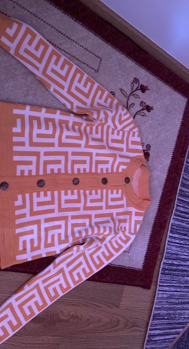 Düğmeli, baskılı desene sahip açık kahverengi uzun hırka. Tekne yaka, uzun kollu ve rahat kesimlidir, günlük sokak stiline uygundur.