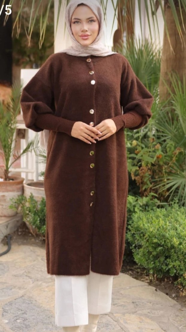 Düğmeli, uzun kesim, bol ve yuvarlak yakalı kahverengi yün hırka. Uzun kollu, modern tarzda, rahat kullanıma uygun. mağaza ürünü renk seçenekleri mevcut standart beden