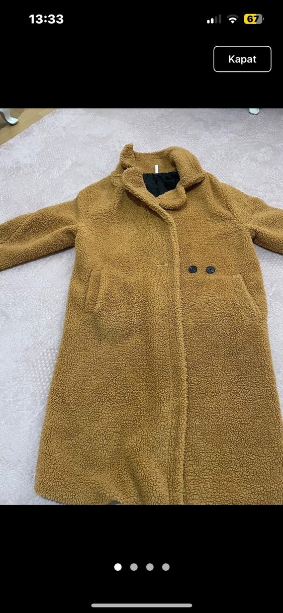 Bu uzun kahverengi kadın kaban, düğmeli ve kesik yakalıdır. Yumuşak, rahat kumaştan yapılmış, bol kesimli ve uzun kolludur. Günlük kullanım için uygundur.