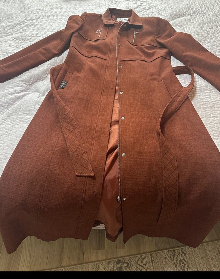 Kahverengi uzun kadın kabanı, düğmeli ön, kesik yaka ve uzun kolludur.giyilmiş ürün yeni değil.iade kabul etmiyorum.sorarak alın lütfen