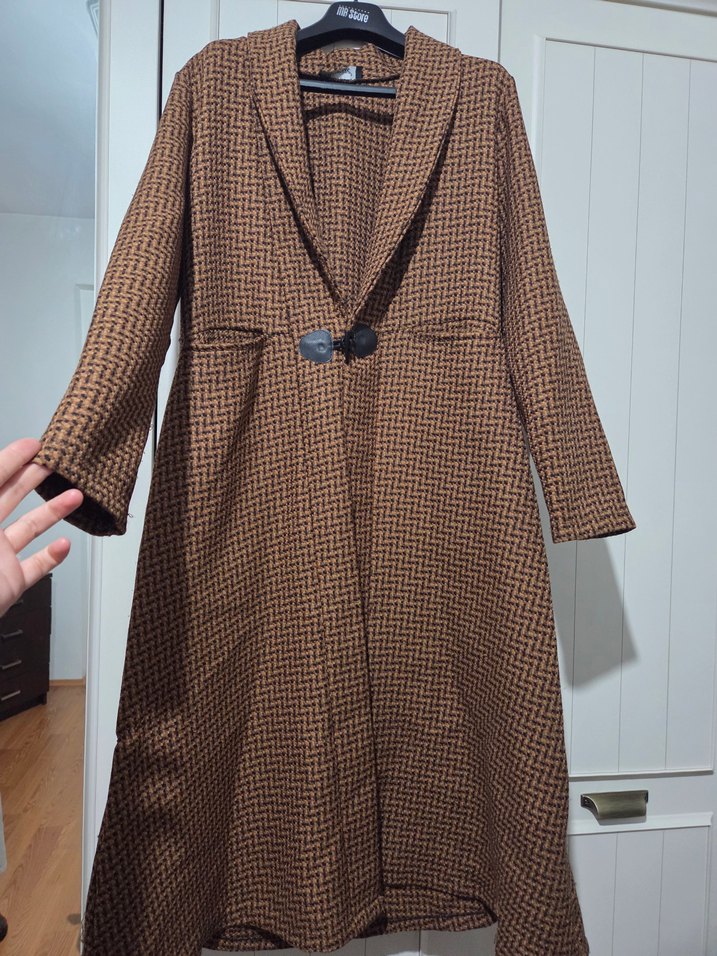 Düğmeli, geniş A kesim uzun kahverengi kadın kaban, yakası kesik ve uzun kolludur. Sentetik kumaştan yapılmıştır, günlük sokak modasına uygun. Mevsimlik giyebileceğiniz kaval kemiğinde biten ceket 1 numara yani 36-38 bedene olur Az giyilmiştir Beden uyuşmazlığı sebebiyle satışta Cepleri mevcut önde 1 tane ilikleme düğmesi vardır
