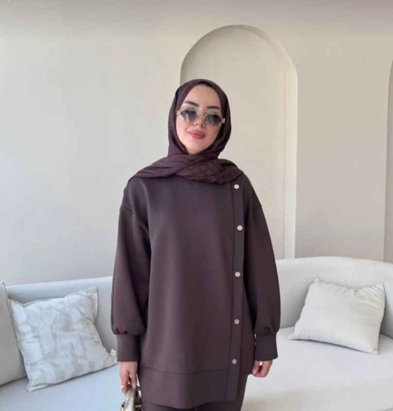 Düğmeli, uzun kesim ve yüksek yakalı kahverengi kadın takımı. Bol kesimi ve uzun kollarıyla sade sokak stili için uygun, sentetik kumaştan üretilmiştir.