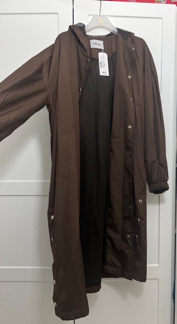 Düğmeli, uzun kahverengi trençkot, bol kesimli ve sentetik kumaştan üretilmiştir. Uzun kollu ve yakasında notalı yaka bulunur.