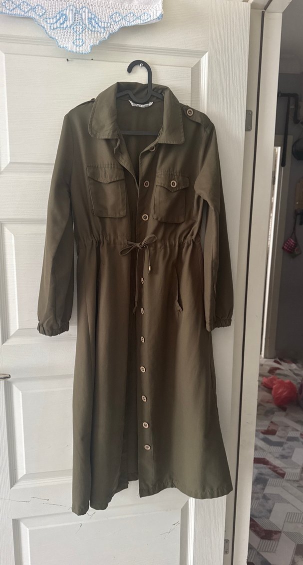 Uzun, bol kesim kadın trençkot, düğmeli ön ve uzun kolludur. Yumuşak keten kumaştan yapılmış, yakası kırmalı ve belinde bağcıklıdır. Kahverengi rengi günlük kullanıma uygundur.