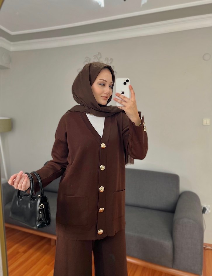 Düğmeli Uzun Kahverengi Kadın Triko Takım