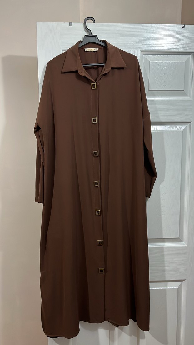 Düğmeli, uzun kahverengi tunik, yakası kesik ve bol kesimdir. Yumuşak ve parlak kumaştan, sade ve günlük kullanıma uygundur.