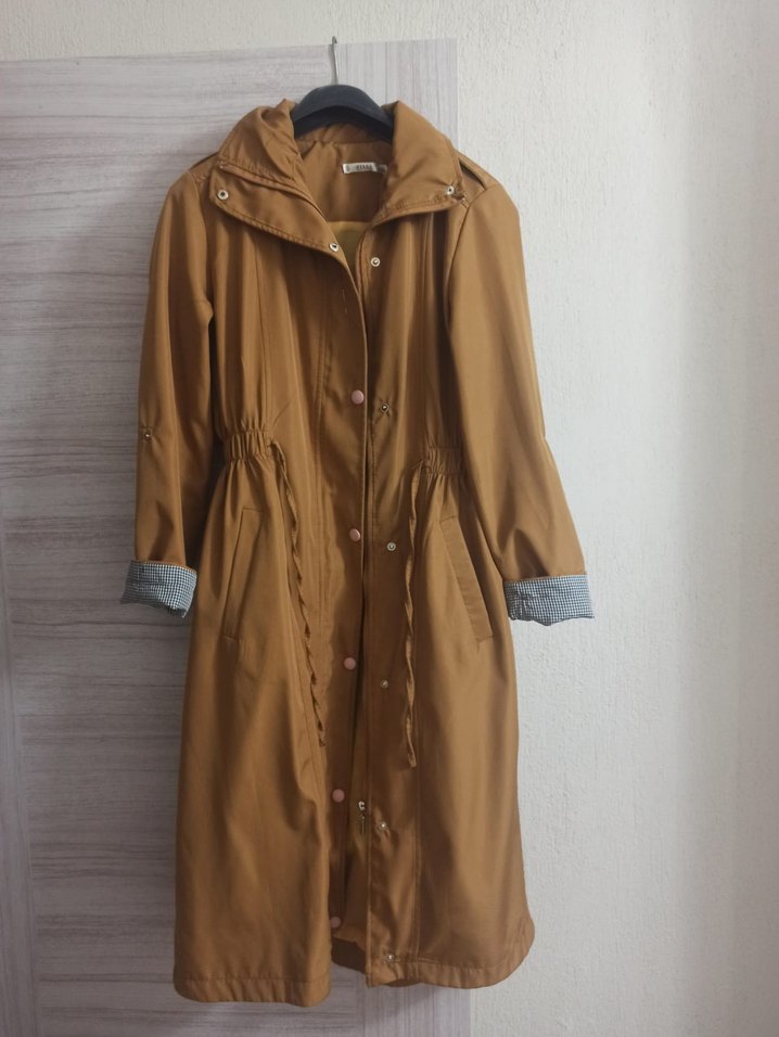 Düğmeli ön kısmı, uzun kollu ve kırmalı yaka detaylı kahverengi kadın yağmurluğu. Sentetik kumaştan, bol kesim ve parlak görünümlü, günlük sokak stili için uygun. ☔