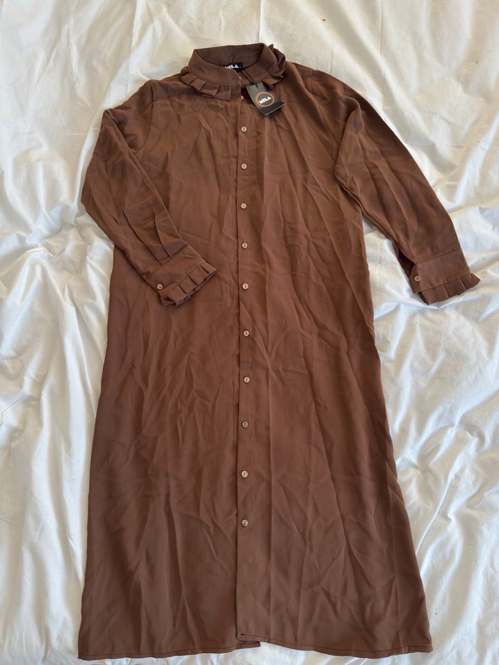 Düğmeli ön kısmı ve yakalı kesimi olan uzun kahverengi tunik. Yumuşak keten kumaştan, uzun kollu ve bol kesimdir. Vintage sokak stili, günlük kullanıma uygundur. Sıfır etiketli ürün