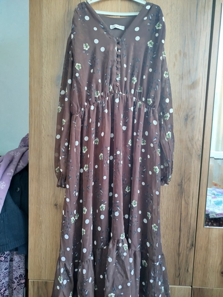 Bu uzun kahverengi elbise, düğmeli ve beyaz puantiyeli desenli, bol kesim ve V yaka, uzun kollu, yumuşak sentetik kumaştan yapılmıştır.