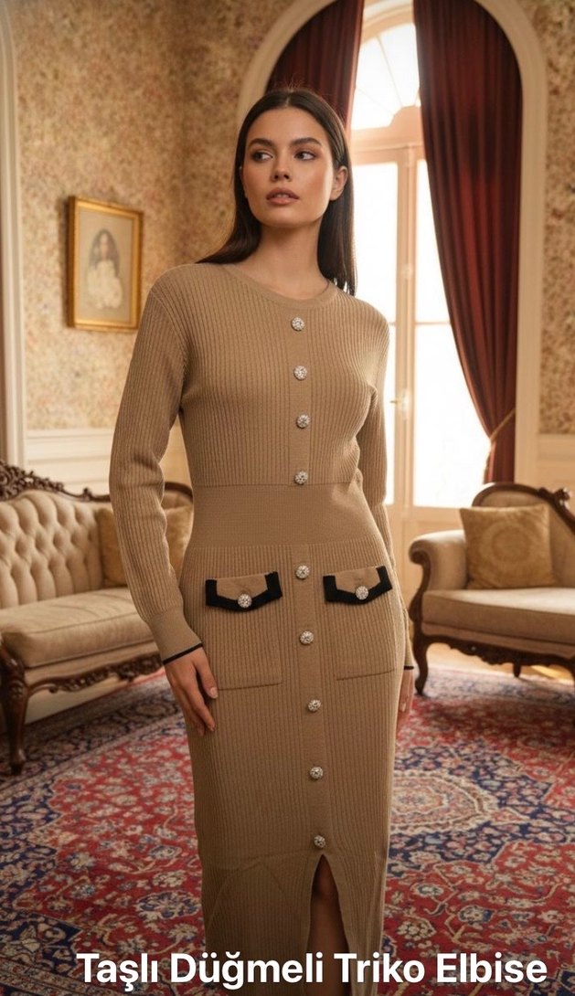 Uzun, açık kahverengi renkli triko elbise, düğmeli ön kısmı ve uzun kolları ile modern klasik Paris tarzını yansıtır. İki cepli, ofis kullanımı için uygundur.