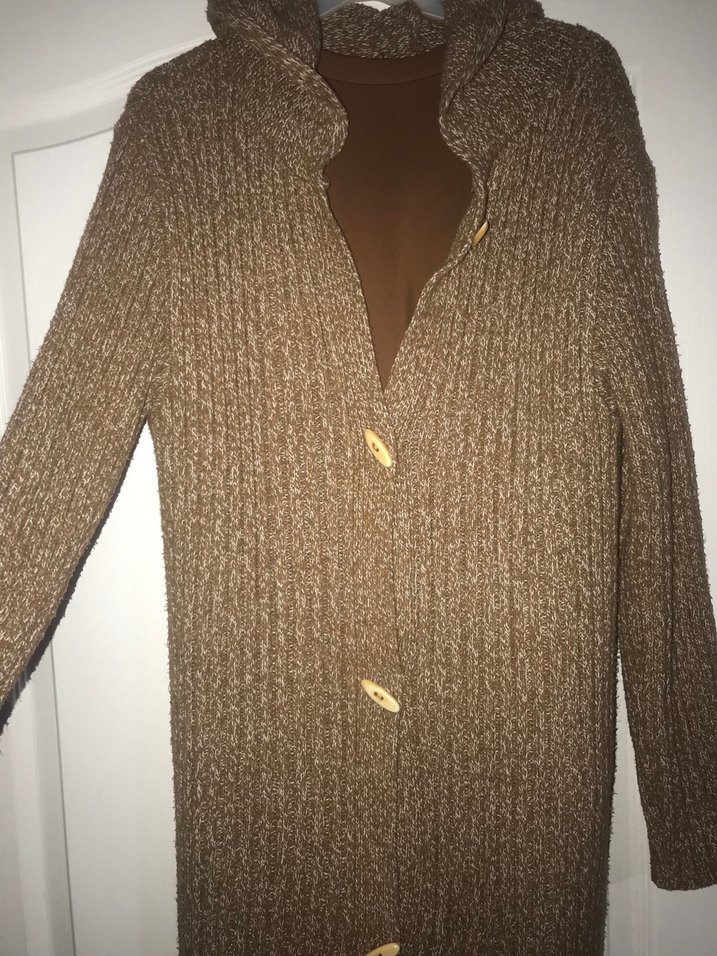Düğmeli, uzun kesim , şapkalı ve yumuşak yün hırka kahverengi tonuyla günlük rahat kullanıma uygundur.