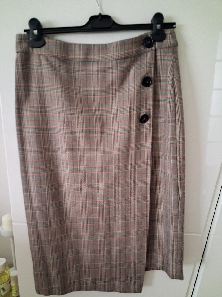 Uzun, düğmeli kapaklı etek, regular kalıp ve ofis ortamına uygun kahve bej tonlarda. Kumaşı pamuklu kareli ve yumuşak dokuludur.