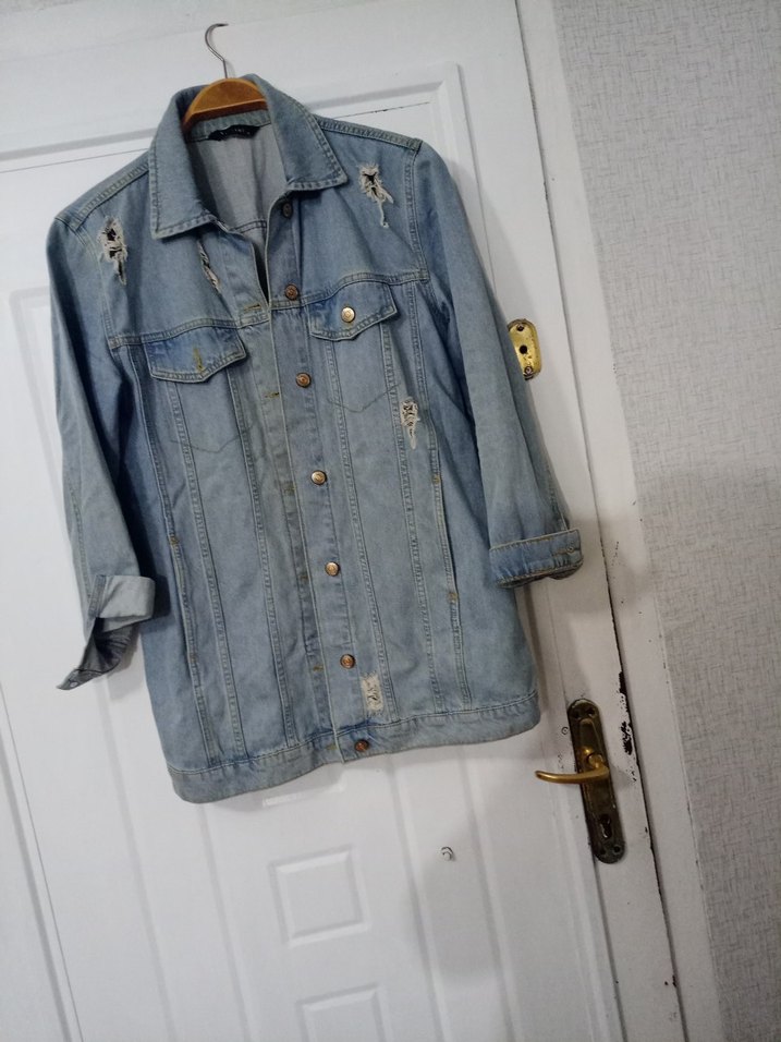 Mavi renkli, düğmeli kapamalı ve uzun kollu, bol kesim kadın denim ceketi. Notlu yakası ve günlük kullanıma uygun rahat tarzı ile dikkat çeker.
