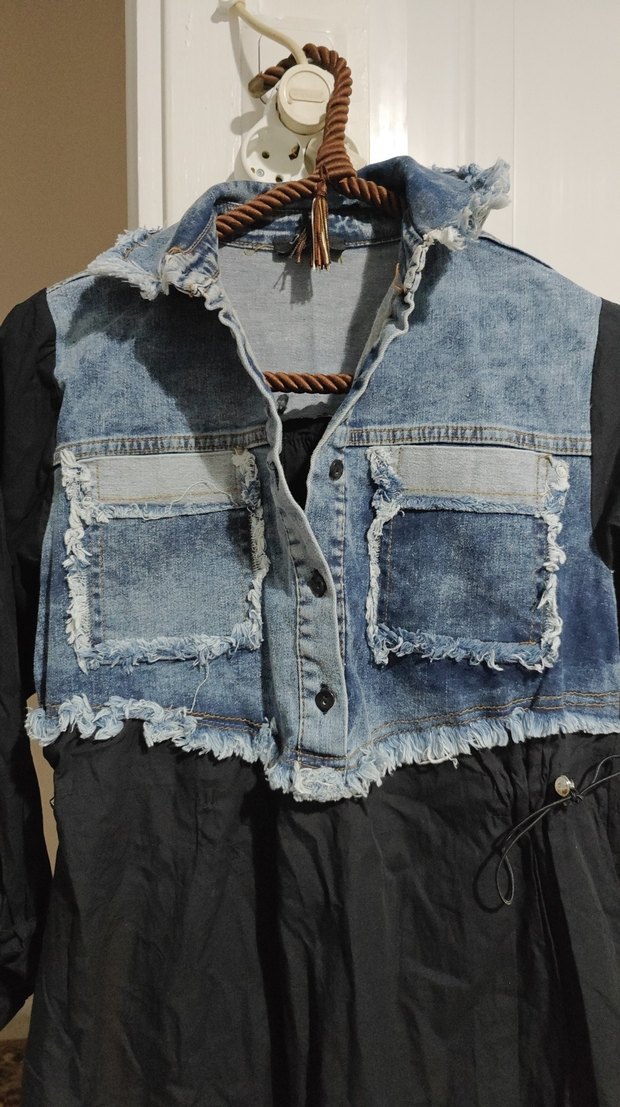 Bu koyu mavi kot ceket, düğmeli ön kısmı, yakalı tasarımı ve bol kesimi ile grunge punk sokak tarzını yansıtıyor. Uzun kesim ve askılı kollara sahip, günlük kullanım için uygun. Yandan Cepli