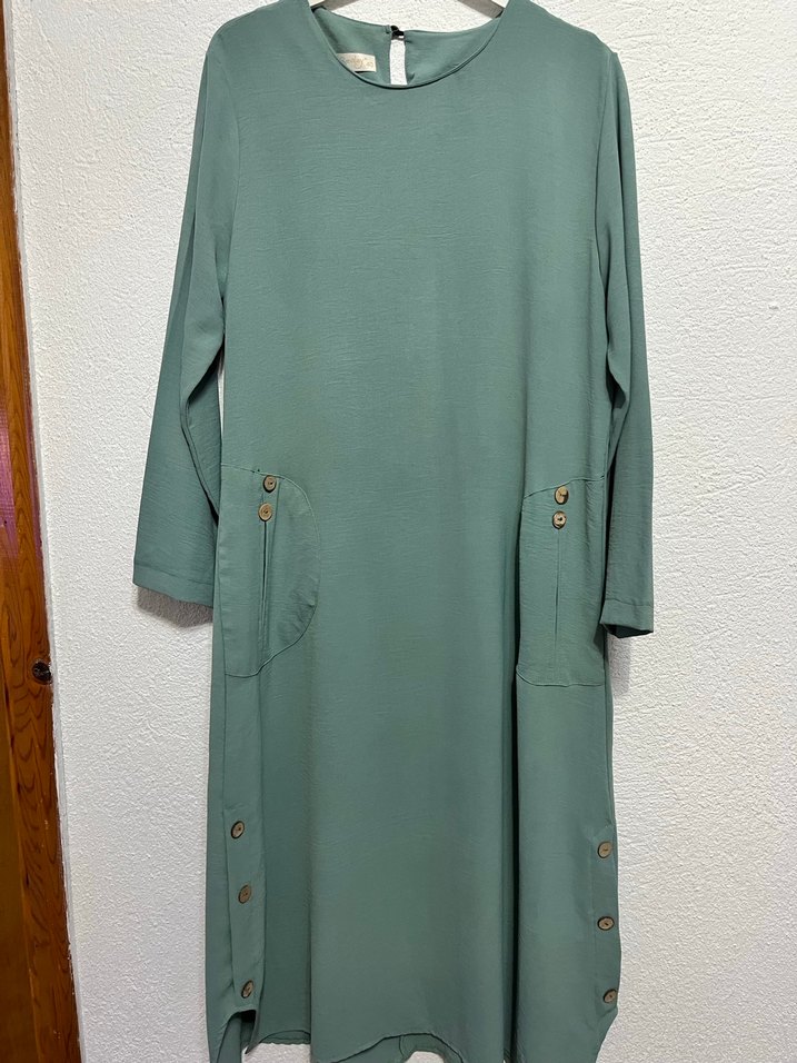 Düğmeli, cepli ve bol kesim uzun kollu tunik. Yuvarlak yaka ve yumuşak sentetik kumaştan üretilmiştir, günlük kullanıma uygundur.