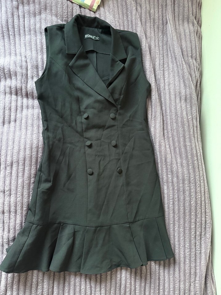 Düğmeli ön kısmı ve kesik yaka detayı olan yeşil uzun kesim, kolsuz kadın elbise. Oturmalı kesimi ve volanlı eteğiyle günlük kullanıma uygun.
