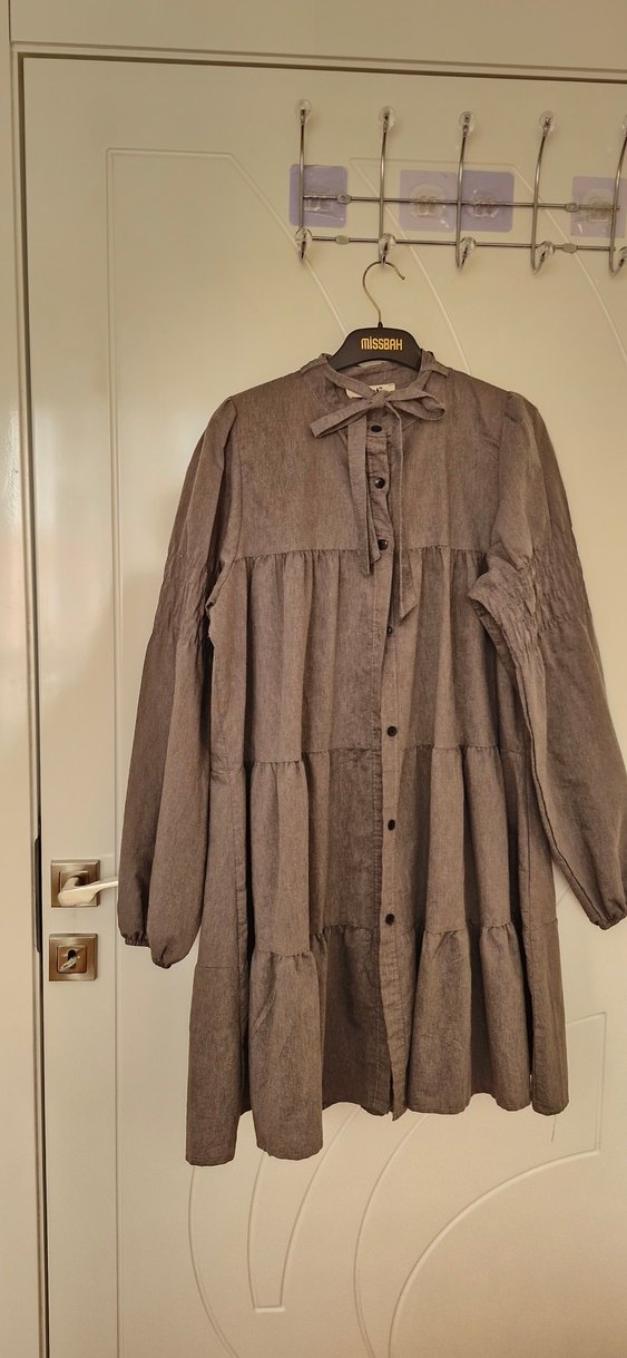 Uzun, bol kesim keten tunik, düğmeli ön ve yakası açık. Kahverengi tonlarında, uzun kollu, bohem Paris tarzını yansıtır.