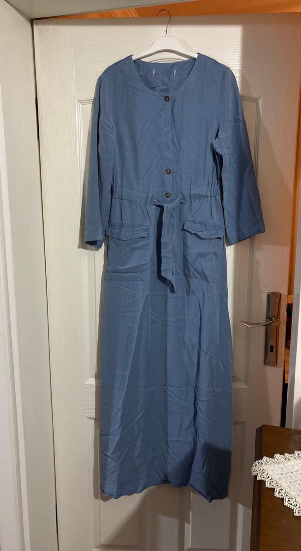 Düğmeli, keten kumaştan uzun ve bol kesim elbise. Mavi-gri tonlarında, uzun kollu ve yakası notlu. Günlük kullanıma uygun, ceplidir. 137 cm bel 36