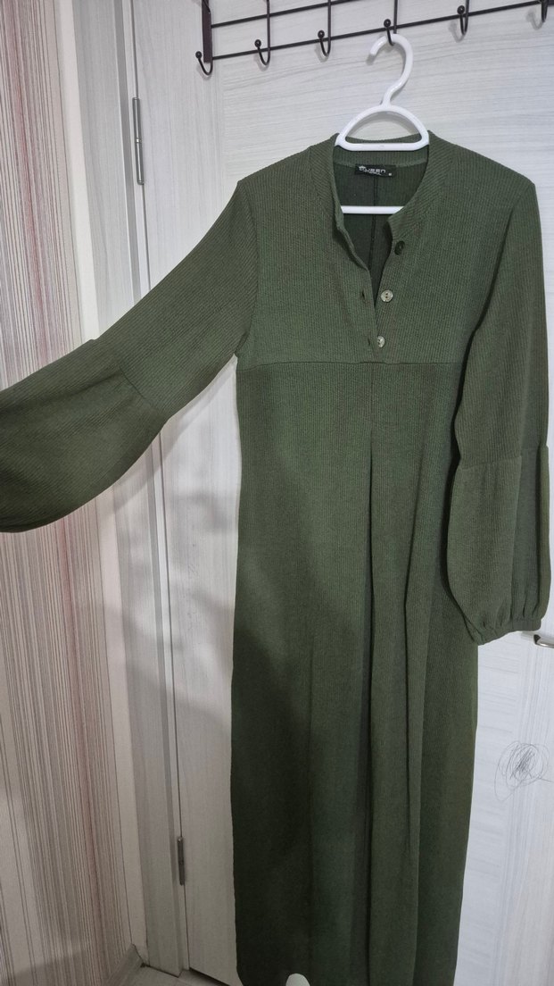 Keten kumaştan yapılmış, düğmeli ve uzun kollu, salaş kesim, notched lapel yakalı haki renk uzun elbise. Minimalist ve sade tarzda, günlük kullanıma uygundur.